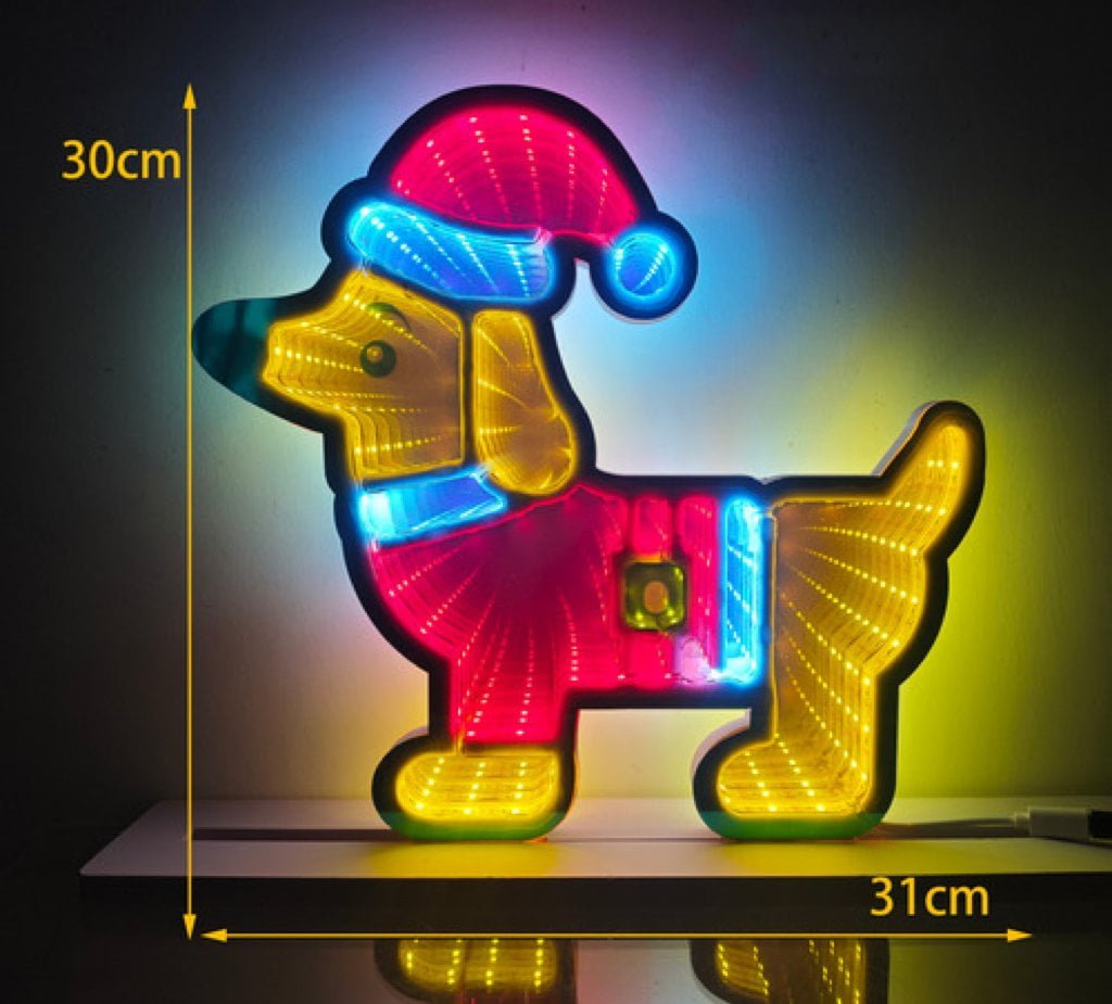 Classic Christmas designs like Santa, snowman, and reindeer combined with a glowing infinity mirror effect. Ideal for retail displays and holiday decoration programs.